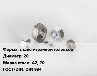 Гайка с шестигранной головкой D=20 Сталь: А2, 70 DIN 934, упаковка 100 шт, нержавеющая сталь цена от 3 734 Р / кг, где купить, условия доставки в Бресте и Брестской области