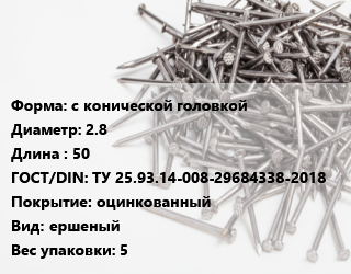 Гвоздь с конической головкой 2.8х50 ГОСТ: ТУ 25.93.14-008-29684338-2018 оцинкованный ершеный 5