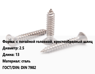 Саморез с потайной головкой, крестообразный шлиц D=2.5 L=13 сталь ГОСТ: DIN 7982