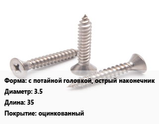 Саморез с потайной головкой, острый наконечник D=3.5 L=35 оцинкованный