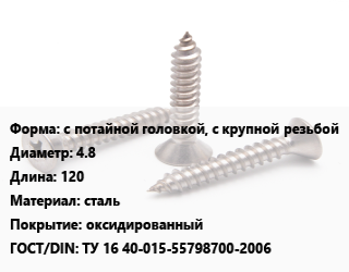 Саморез с потайной головкой, с крупной резьбой D=4.8 L=120 сталь оксидированный ГОСТ: ТУ 16 40-015-55798700-2006, кг цена от 133.91 Р / кг, где купить, условия доставки в Бресте и Брестской области