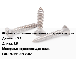 Саморез с потайной головкой, с острым концом D=3.9 L=9.5 нержавеющая сталь ГОСТ: DIN 7982