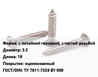 Саморез с потайной головкой, с частой резьбой D=3.5 L=19 оцинкованный ГОСТ: ТУ 7811-7359 BY 009