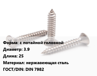 Саморез с потайной головкой D=3.9 L=25 нержавеющая сталь ГОСТ: DIN 7982