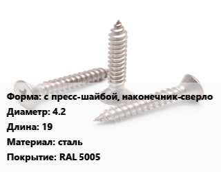 Саморез с пресс-шайбой, наконечник-сверло D=4.2 L=19 сталь RAL 5005, упаковка 1000 шт цена от 678.94 Р / кг, где купить, условия доставки в Бресте и Брестской области