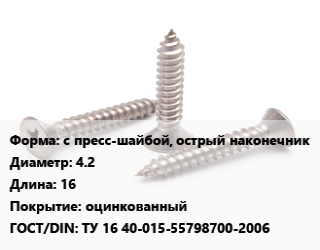 Саморез с пресс-шайбой, острый наконечник D=4.2 L=16 оцинкованный ГОСТ: ТУ 16 40-015-55798700-2006