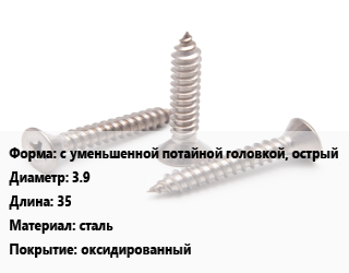 Саморез с уменьшенной потайной головкой, острый D=3.9 L=35 сталь оксидированный