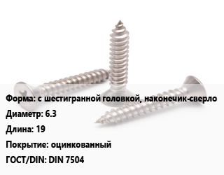Саморез с шестигранной головкой, наконечик-сверло D=6.3 L=19 оцинкованный ГОСТ: DIN 7504