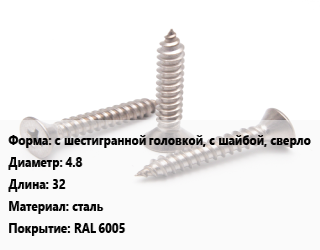 Саморез с шестигранной головкой, с шайбой, сверло D=4.8 L=32 сталь RAL 6005