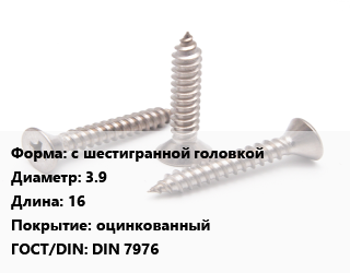 Саморез с шестигранной головкой D=3.9 L=16 оцинкованный ГОСТ: DIN 7976