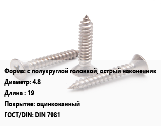 Саморез с полукруглой головкой, острый наконечник D=4.8 L=19 оцинкованный ГОСТ: DIN 7981