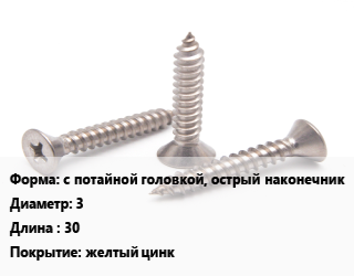 Саморез с потайной головкой, острый наконечник D=3 L=30 желтый цинк, упаковка 18000 шт цена от 3 116 Р / кг, где купить, условия доставки в Бресте и Брестской области