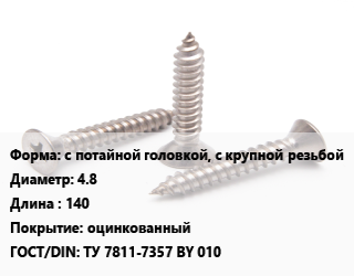 Саморез с потайной головкой, с крупной резьбой D=4.8 L=140 оцинкованный ГОСТ: ТУ 7811-7357 BY 010