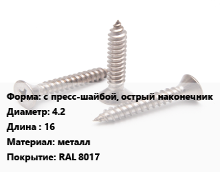 Саморез с пресс-шайбой, острый наконечник D=4.2 L=16 металл RAL 8017, упаковка 40 шт цена от 63 Р / кг, где купить, условия доставки в Бресте и Брестской области
