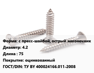 Саморез с пресс-шайбой, острый наконечник D=4.2 L=75 оцинкованный ГОСТ: ТУ BY 400024166.011-2008, упаковка 1000 шт, РМЗ цена от 1 348 Р / кг, где купить, условия доставки в Бресте и Брестской области
