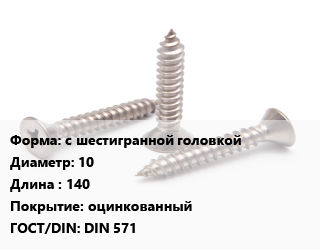 Саморез с шестигранной головкой D=10 L=140 оцинкованный ГОСТ: DIN 571