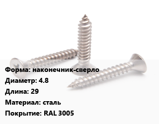 Саморез наконечник-сверло D=4.8 L=29 сталь RAL 3005, шт цена от 2.73 Р / кг, где купить, условия доставки в Бресте и Брестской области