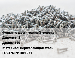 Шуруп с шестигранной головкой 8х150 нержавеющая сталь ГОСТ: DIN 571, шт цена от 90.96 Р / кг, где купить, условия доставки в Бресте и Брестской области