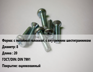 Винт с потайной головкой, с внутренним шестигранником 8х20 DIN 7991 оцинкованный, 10.9,8.8, цена за шт, кг цена от 7.95 Р / кг, где купить, условия доставки в Бресте и Брестской области
