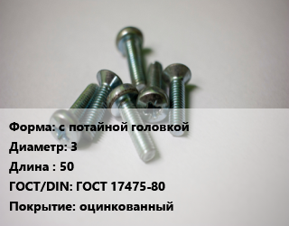 Винт с потайной головкой 3х50 ГОСТ 17475-80 оцинкованный, упаковка 1000 шт, кг цена от 545.46 Р / кг, где купить, условия доставки в Бресте и Брестской области