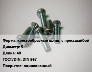 Винт крестообразный шлиц, с прессшайбой 5х40 DIN 967 оцинкованный
