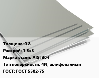 Лист нержавеющий 0.8 1.5х3 Сталь: AISI 304 Тип:4N, шлифованный ГОСТ 5582-75