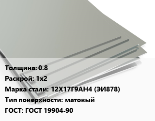 Лист нержавеющий 0.8 1х2 Сталь: 12Х17Г9АН4 (ЭИ878) Тип:матовый ГОСТ 19904-90