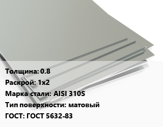 Лист нержавеющий 0.8 1х2 Сталь: AISI 310S Тип:матовый ГОСТ 5632-83