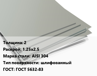 Лист нержавеющий 2 1.25х2.5 Сталь: AISI 304 Тип:шлифованный ГОСТ 5632-83